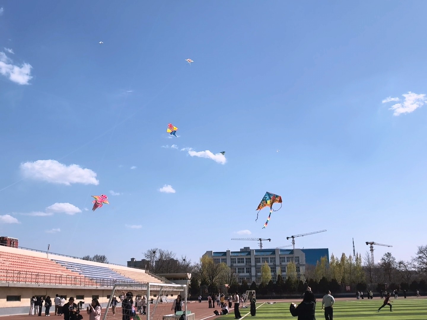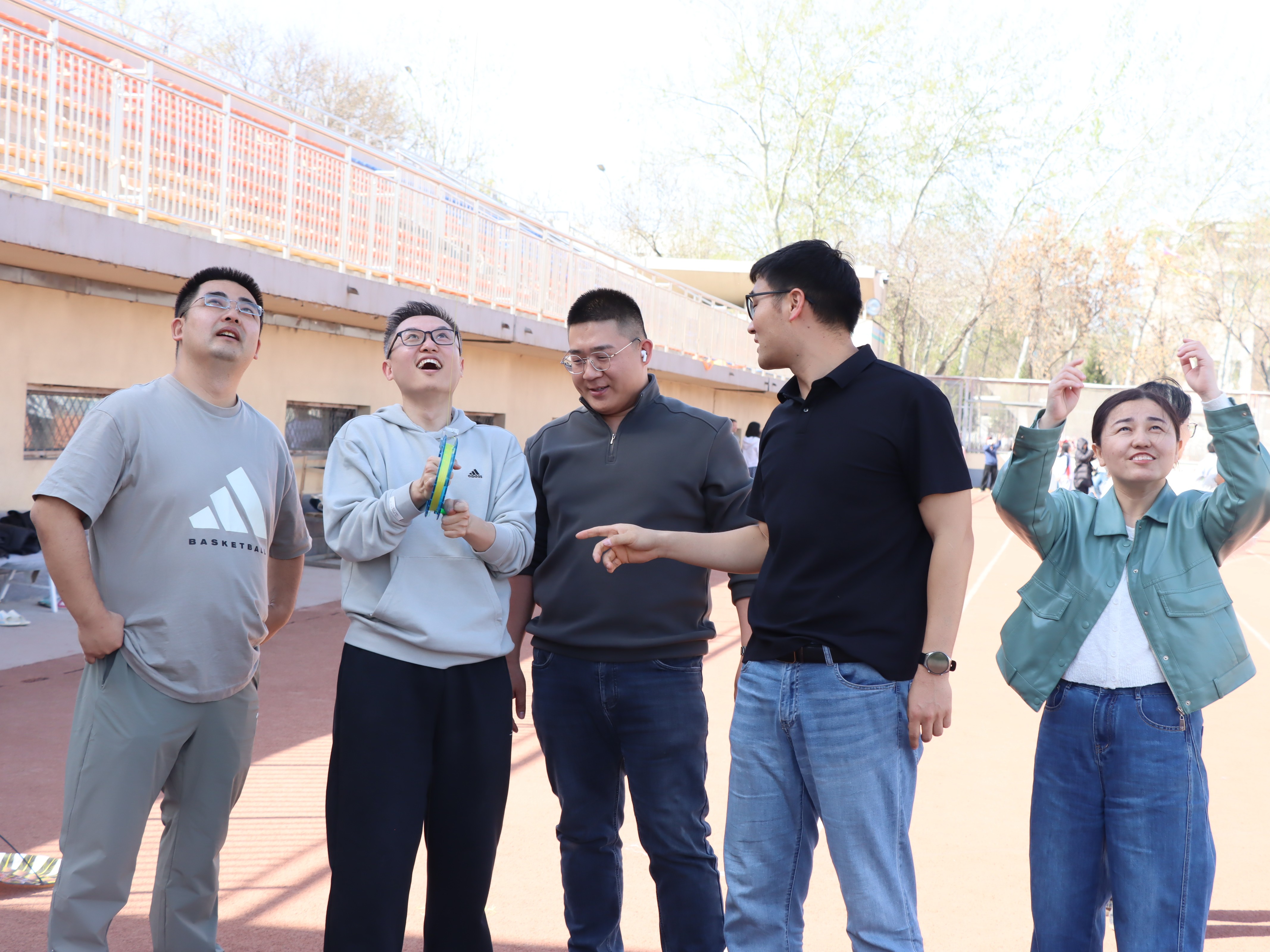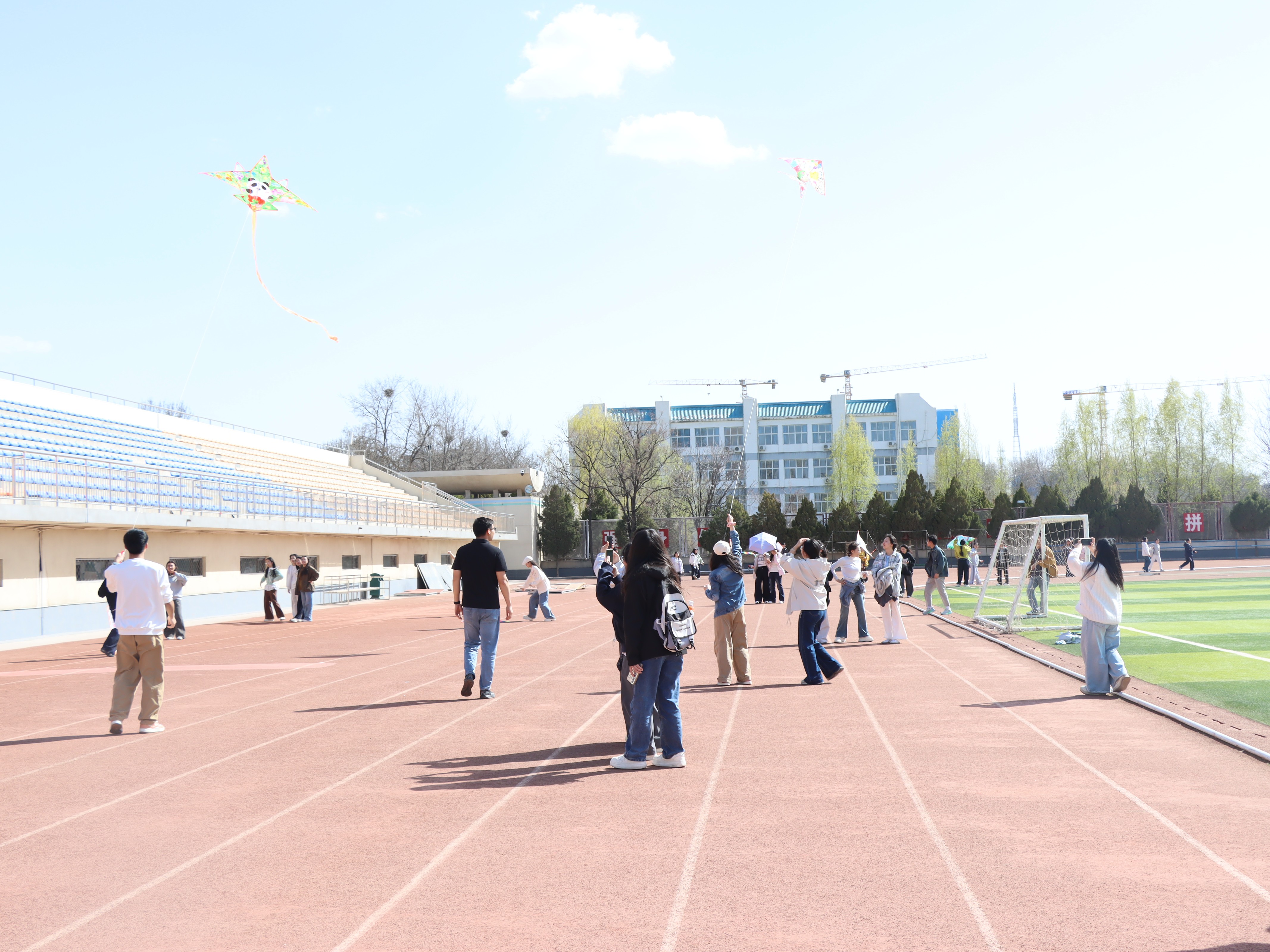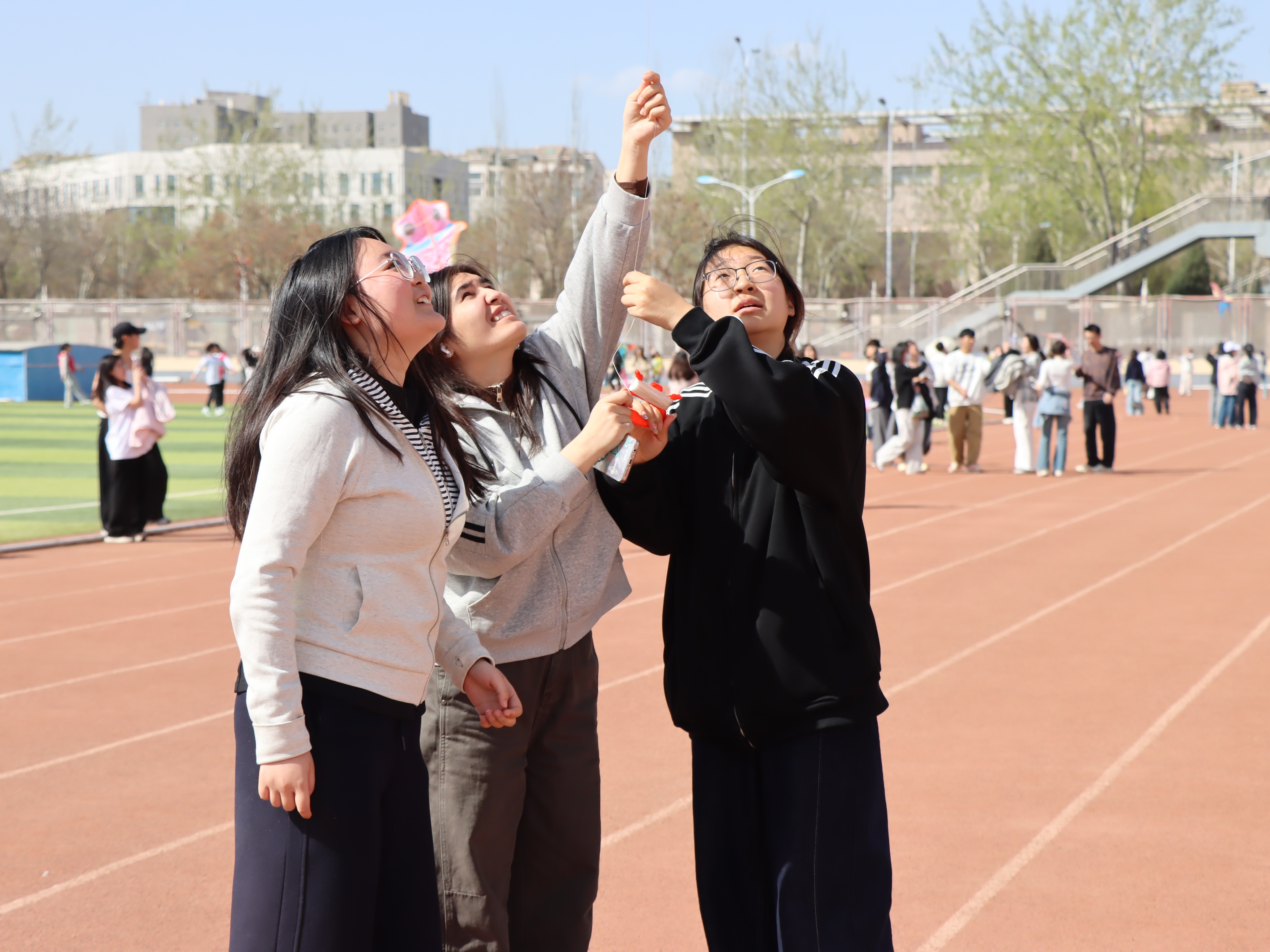 创作完成后,户外放飞环节正式开启。春日暖阳洒满操场,和煦春风轻拂耳畔,同学和老师们手持亲手绘制的风筝,两两配合、齐心协力,牵着风筝线在运动场上肆意奔跑。一只只承载着青春梦想与团结心意的风筝徐徐升空,在蓝天白云间自由翱翔,大家的欢声笑语与春风交织,勾勒出校园里最生动的春日图景。在活动过程中,同学们的学业压力得到充分释放,各族同学的情谊也在携手逐风的过程中愈发深厚。